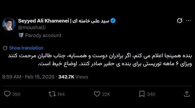 در یکی از این موارد، حسابی به نام علی خامنهای، رهبر جمهوری اسلامی، بدون اشاره مستقیم به تهدیدهای نظامی، پیامی با این محتوا منتشر کرد: «اگر برادران دوست و همسایه، جناب طالبان مرحمت کنند ویزای ششماهه توریستی صادر کنند، اوضاع خیط است.»