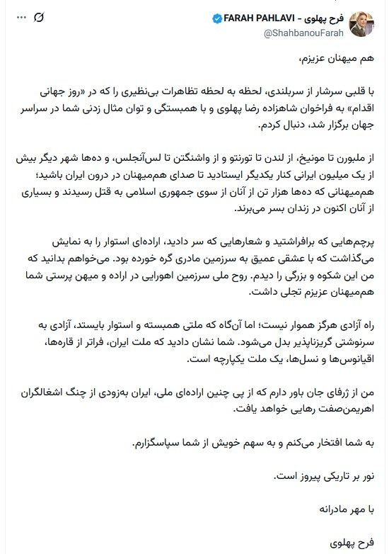 شهبانو فرح پهلوی افزود: «از ملبورن تا مونیخ، از لندن تا تورنتو و از واشینگتن تا لسآنجلس، و دهها شهر دیگر بیش از یک میلیون ایرانى کنار یکدیگر ایستادید تا صدای هممیهنان در درون ایران باشید؛ هممیهنانی که دهها هزار تن از آنان از سوی جمهوری اسلامی به قتل رسیدند و بسیاری از آنان اکنون در زندان بهسر میبرند.»