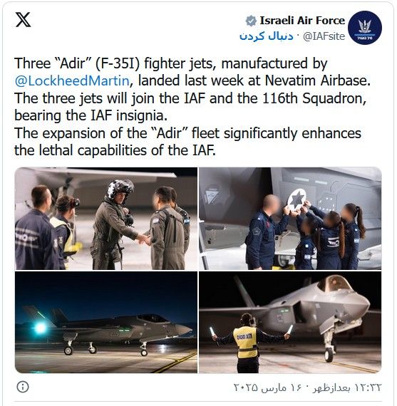 ایندیپندنت فارسی: یخیل لیتر، سفیر اسرائیل در ایالات متحده، در مصاحبهای با روزنامه اسرائیل هیوم، ادعا کرد که اسرائیل جتهای جنگنده اف۳۵آی (F-35I) خود را بهگونهای اصلاح کرده است که از قابلیت افزایش برد از طریق مخازن سوخت اضافی برخوردار شوند، بیآنکه ویژگی رادارگریزی آنها خدشهدار شود.لیتر میگوید: «ما مخازن سوخت را به گونهای توسعه دادیم که برد هواپیما را بدون احتمال شناسایی، افزایش میدهد. همچنین چهار موشک به بالها اضافه کردیم.»