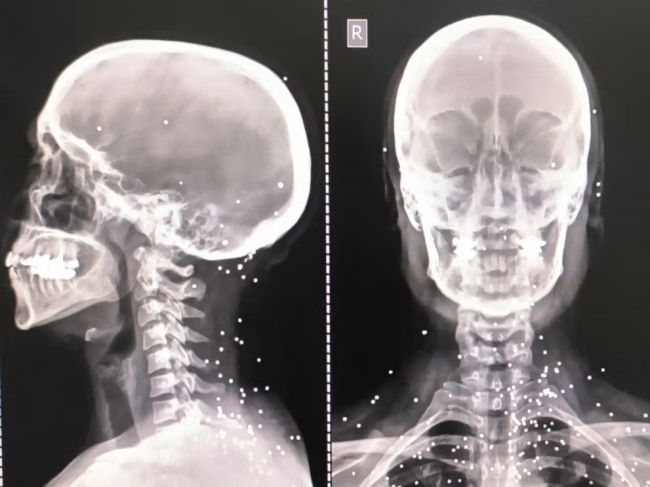 در تصاویر دیگر نیز گلولههایی در نزدیکی ستون فقرات یا مسیرهای مشخص تخریب بافت و استخوان دیده میشود.