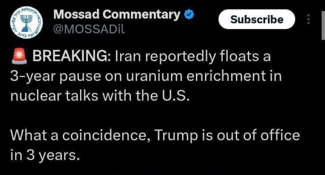 توئیت موساد: گزارش شده که ایران پیشنهاد توقف ۳ ساله غنیسازی را مطرح کرده است، چه تصادفی ترامپ ۳ سال دیگر از قدرت خارج میشود!