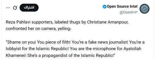 یورونیوز: در ویدئویی که در شبکههای اجتماعی همرسان شده، دیده میشود که در پایان یک رویداد در پیوند با ایران، چند نفر از شرکتکنندگان به طرف کریستین امانپور، خبرنگار باسابقه ایرانی-بریتانیایی رفته و به او شدیدا اعتراض میکنند.این افراد که خود را طرفدار پهلوی میخوانند، به خانم امانپور میگویند که او به جانباختگان اعتراضات ایران «توهین» کرده است، اما او این اتهام را رد میکند و در حالی که چند تن از حاضران به او ناسزا میگویند، از محل دور میشود.