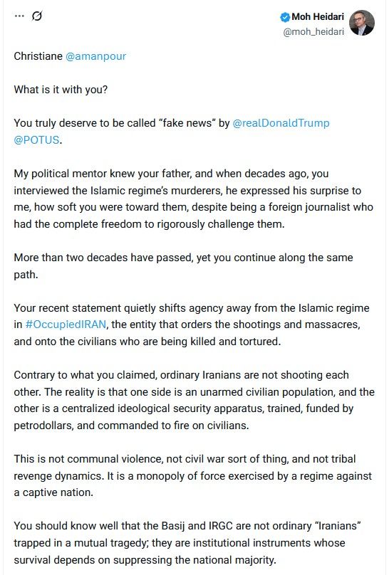 My political mentor knew your father, and when decades ago, you interviewed the Islamic regime’s murderers, he expressed his surprise to me, how soft you were… pic.twitter.com/m9JMabO8NP