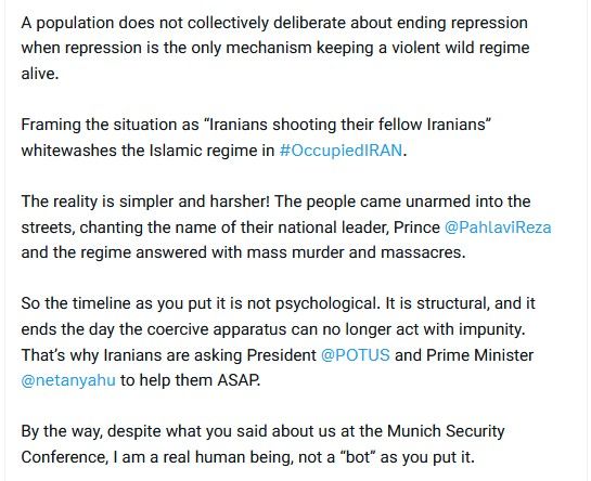 واقعیت سادهتر و تلختر است: مردم غیرمسلح به خیابان آمدند و نام رهبر ملی خود، رضا پهلوی را فریاد زدند؛ و رژیم با کشتار و قتلعام پاسخ داد.