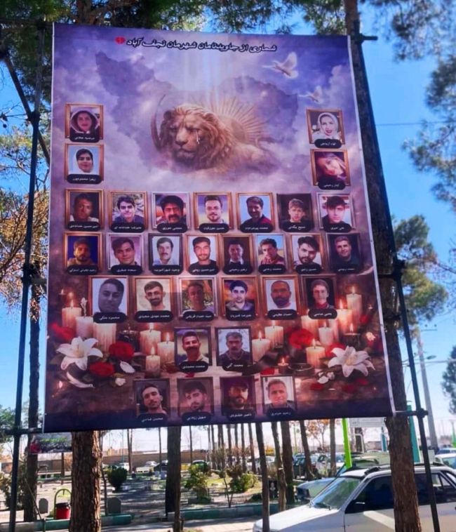 در شبکههای اجتماعی تصویری از بنر بزرگی از عکس شماری از جاویدنامان شهر نجفآباد منتشر شده که در آرامستان این شهر نصب شده است و بالای آن نشان شیر و خورشید دارد.
