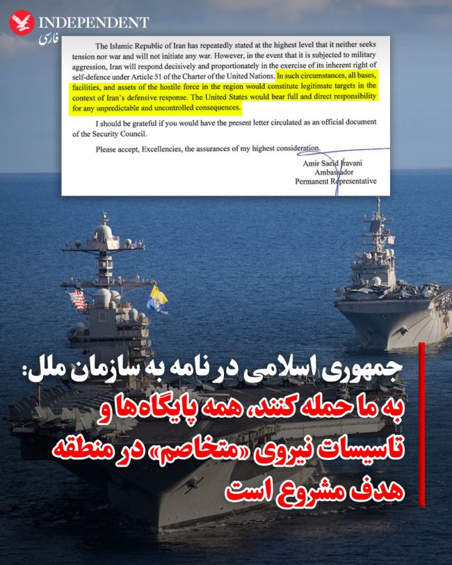 جمهوری اسلامی در نامه به سازمان ملل: به ما حمله کنند، همه پایگاهها و تاسیسات نیروی«متخاصم» در منطقه هدف مشروع است