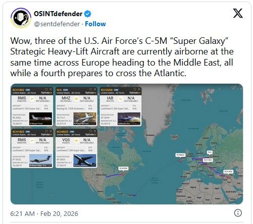 یورونیوز: در حالی که گمانهزنیها درباره وقوع یک درگیری نظامی گسترده با ایران افزایش یافته است، گزارشهای ردیابی پرواز نشان میدهند که دستکم ۴ فروند از غولپیکرترین هواپیماهای ترابری ارتش آمریکا، یعنی لاکهید سی-۵ گلکسی، در حال عبور از اقیانوس اطلس به سمت پایگاههای پیشرو در منطقه دیده شدهاند.این جابهجایی سنگین هوایی که در روزهای اخیر شدت یافته است، نشاندهنده انتقال تجهیزات فوقسنگین نظامی است که معمولا پیشدرآمدی برای عملیاتهای رزمی وسیع محسوب میشود.
