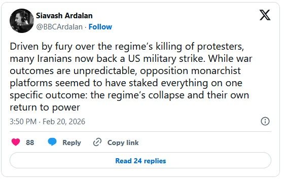 سیاوش اردلان در شبکه اکس نوشت:بسیاری از ایرانیان که از کشتار معترضان توسط رژیم به خشم آمدهاند، اکنون از حمله نظامی آمریکا حمایت میکنند. با وجود اینکه پیامدهای جنگ غیرقابلپیشبینی است، به نظر میرسد تریبونهای اپوزیسیون پادشاهیخواه همه چیز را روی یک نتیجه مشخص شرطبندی کردهاند: فروپاشی رژیم و بازگشت خودشان به قدرت...»