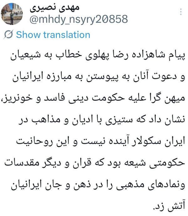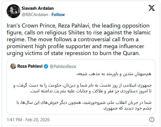 «شاهزاده رضا پهلوی، چهره برجسته اپوزیسیون ایران، از شیعیان مذهبی خواسته است تا علیه رژیم اسلامی به پا خیزند. این درخواست در پی فراخوان جنجالی یکی از حامیان سرشناس بسیار پرمخاطب (علی کریمی) مطرح میشود که از قربانیان سرکوبهای دولتی خواسته بود قرآن را به آتش بکشند.»