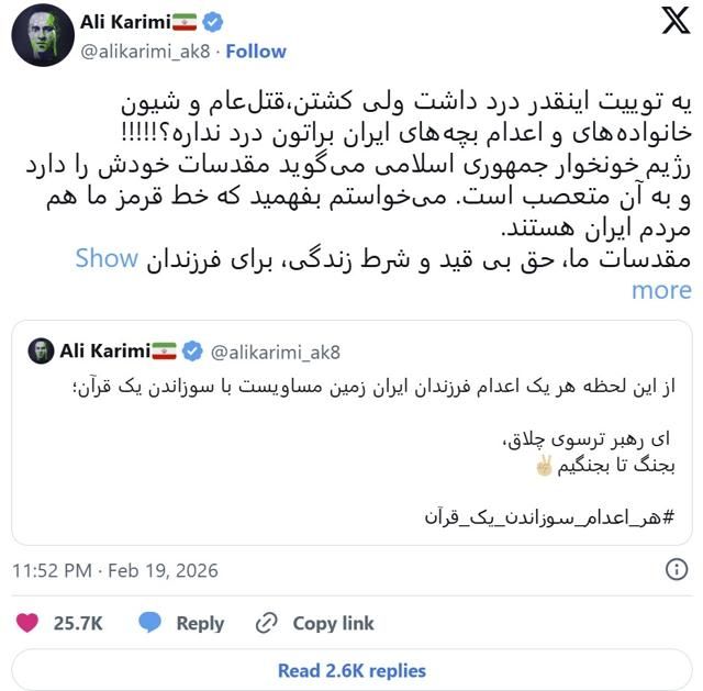 توئیت علی کریمی در مورد پست قبلی خود در تهدید به قرآنسوزیعلی کریمی در اکس نوشت: