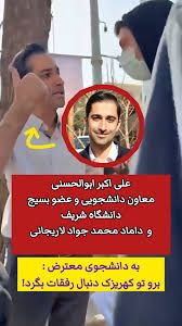 ویدیویی وایرال شده از شخصی یه اسم علی اکبر ابوالحسنی، عضو بسیج دانشگاه شریف که امروز خطاب به یکی از دانشجویان معترض گفته: برو کهریزک دنبال رفیقات بگرد.علی شریفی زارچی هم گفت: فکر نکنید این شخص محض رضای خدا از رژیم دفاع میکنه این آقا داماد محمدجواد لاریجانی هست