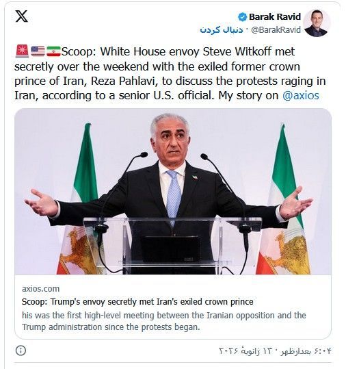 باراک راوید، خبرنگار اکسیوس، بعدازظهر سهشنبه ۲۳ دی خبر داد که استیو ویتکاف، نماینده ویژه دونالد ترامپ، با شاهزاده رضا پهلوی، ولیعهد پیشین ایران، «محرمانه» دیدار و گفتوگو کرده است.او به نقل از یک «مقام ارشد آمریکایی» که نامش فاش نشده است، نوشته که محور این دیدار و گفتوگو، اعتراضات گسترده در ایران بوده است.