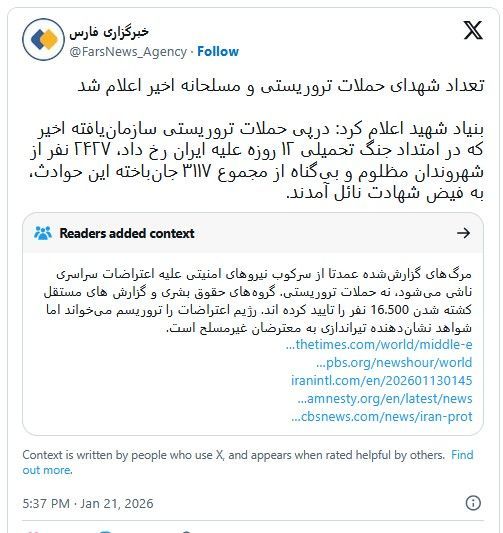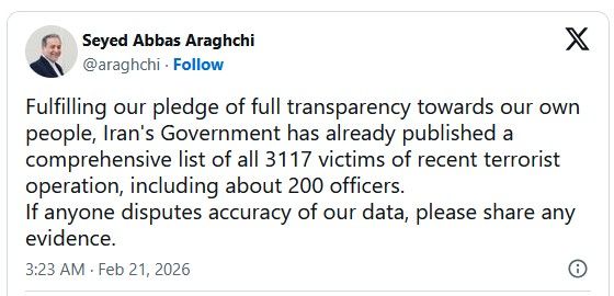 ۱) آقای عباس عراقچی، معاون وزیر خارجه و سخنگوی دولت، در اظهاراتی گفته است که بر اساس دادههای وزارت بهداشت ایران، ۳۱۱۷ نفر در اعتراضهای سراسری کشته شدهاند. این آمار در حالی اعلام شد که منابع مستقل و مدافع حقوق بشر ارقام بسیار بالاتری را گزارش دادهاند، و همین اختلاف باعث ایجاد شک و تردید در اعتبار آمار رسمی شده است.