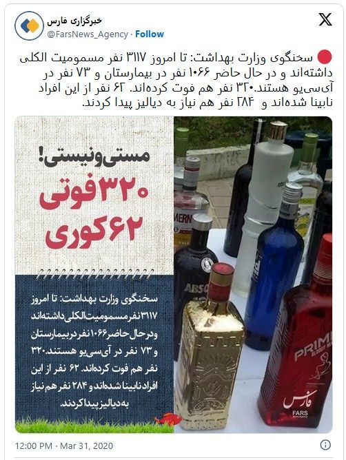 ۴)آمار وزارت بهداشت درباره مسمومیت با الکل نیز دقیقاً همین عدد را نشان میدهد -- ۳۱۱۷ نفر. این اتفاق به خودی خود جالب است، اما تکرار آن در زمینههای متفاوت به نظر میرسد بیش از حد تصادفی باشد.