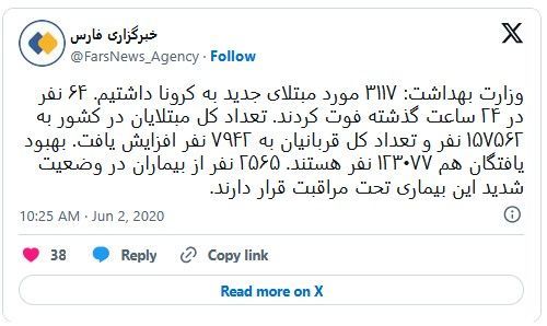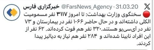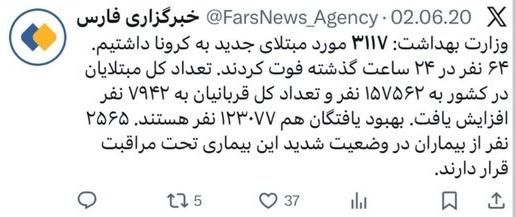 ۳) اینکه در گزارشهای علمی مرتبط با همهگیری کووید-۱۹ نیز ۳۱۱۷ مورد تأیید شده بهعنوان تعداد بیماران اعلام شده، که این عدد در مقطعی از شیوع ویروس در ایران گزارش شده است. منبع این گزارش یک نشریه علمی بوده است، اما باز هم سؤال این است که چگونه این عدد با سایر آمارهای رسمی همنشینی دارد.