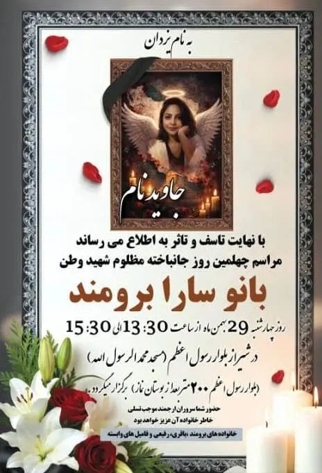 روی سنگ مزارش نوشتهاند: «اندوهگین مباش سرزمین من، در شکاف زخمهای تو، بذر گل کاشتهام، تو روزی گلستان خواهی شد» و تصویری از سارا بر بالای سنگ مزار نصب شده است با بالهایی گشوده. «سارا برومند» متولد سال ۱۳۷۶ بود. جمعه ۱۹دی۱۴۰۴ با مادرش از درمانگاه به خانه بازمیگشت که مامور موتورسوار یگانویژه دنبالش کرد، از فاصلهای حدودا پنج متری، با سلاح ساچمهای سر و گردنش را هدف گرفت و سارا، مادر پسر خردسال سهسالونیمه را کشت. در آغوش مادرش جان داد. زن جوانی که دو سال مانده بود تحصیل خود را در رشته «حقوق» به پایان برساند، هنرمند بود. نزدیکان و رفقایش، شامگاه پنجشنبه ۳۰بهمن، در محل کشتهشدن سارا، برایش شمع روشن کردند، گل ریختند و یادش را گرامی داشتند.
