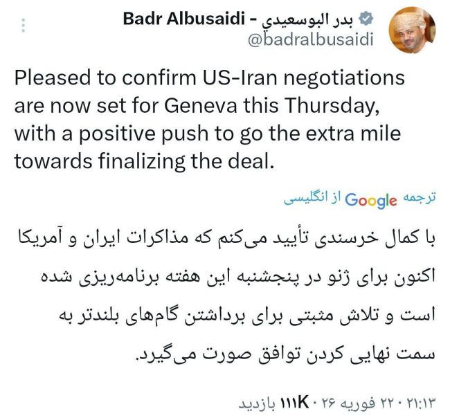 بدر البوسعیدی شامگاه یکشنبه سوم اسفند در شبکه ایکس نوشت: «خوشحالم تأیید کنم که مذاکرات آمریکا و ایران اکنون برای روز پنجشنبه در ژنو برنامهریزی شده است، با تلاشی مثبت برای برداشتن گام نهایی و نهاییسازی توافق.»