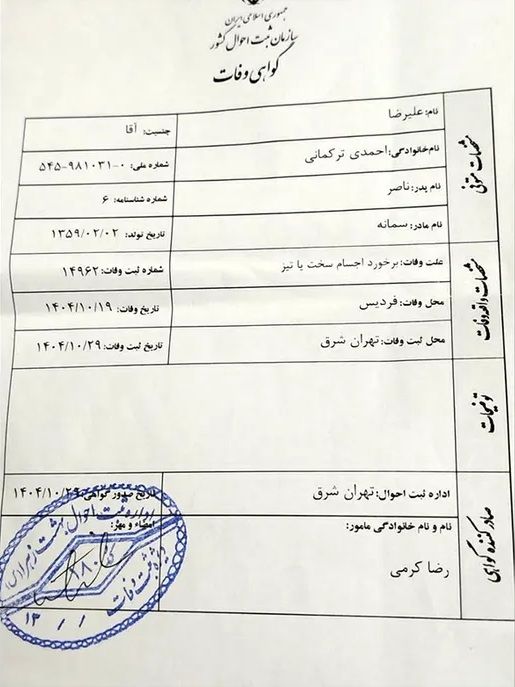 در گواهی وفات علیرضا احمدی ترکمانی علت وفات برخورد اجسام سخت یا تیز عنوان شده است. علیرضا اما با شلیک ماموران جمهوری اسلامی در اعتراضات ۱۸دی فردیس کرج کشته شددو ساعت سرگردانی در خیابانها با پیکر علیرضا در آغوش