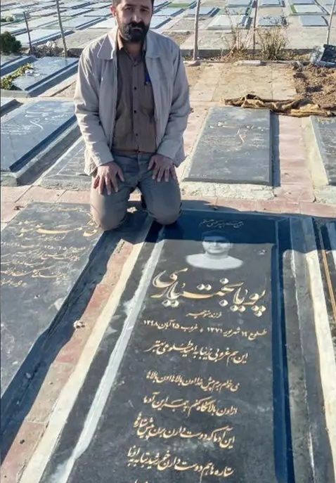 علیرضا در کنار مزار پویا بختیاری، از کشتهشدگان اعتراضات آبان ۱۳۹۸روز خاکسپاری او اینترنت قطع بود و خیلیها اطلاع نداشتند. ولی باز هم بیشتر از هزار نفر حضور داشتند. به دست فروشها خیلی کمک میکرد، همه آنها آمده بودند.