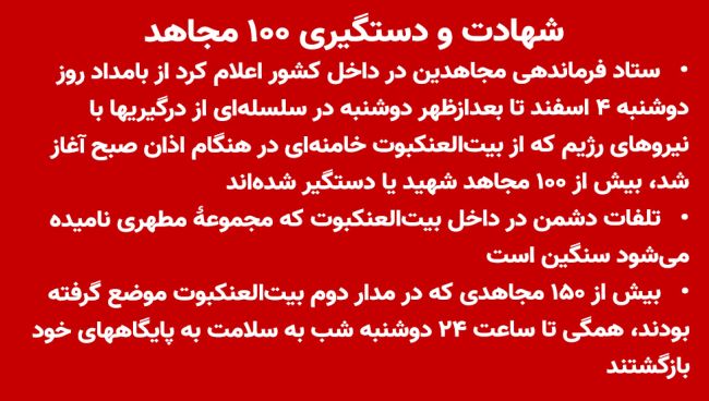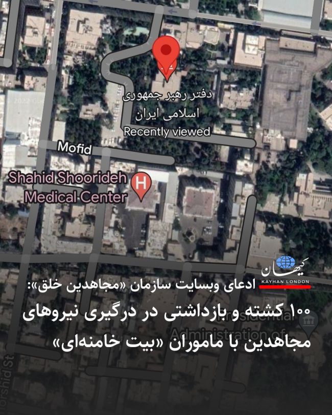 کیهان لندن: ادعای وبسایت سازمان «مجاهدین خلق»: ۱۰۰ کشته و بازداشتی در درگیری نیروهای مجاهدین با ماموران «بیت خامنهای» وبسایت سازمان «مجاهدین خلق» در گزارشی مدعی شد از بامداد روز دوشنبه ۴ اسفند تا بعدازظهر دوشنبه «در سلسلهای از درگیریها با نیروهای رژیم» در اطراف «بیت علی خامنهای» بیش از ۱۰۰ نیروی این سازمان کشته یا دستگیر شدهاند.در همین گزارش اشاره شد تلفات نیروهای امنیتی مستقر در «مجموعه مطهری» (مشهور به بیت رهبری) سنگین است.