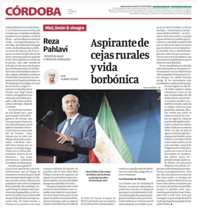در مقالهای در نشریه کوردوبا آمده است که رضا پهلوی در کنفرانس امنیتی مونیخ با این سخنان که در ایران مردم نام او را در خیابانها فریاد میزنند، فراخواندن ایرانیان به خیابانها را که بنا بر گزارشها ۷ هزار تا ۱۱ هزار کشته به جا گذاشته، توجیه کرد. در همین مطلب نوشته شده مردمی که در مونیخ تظاهرات کردند و خواستار تغییر رژیم در ایران بودند، مخالف این بودند که پسر شاه قرار باشد کشور را اداره کند.