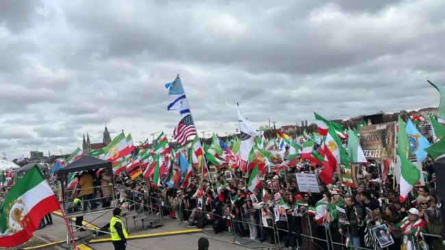 تظاهرکنندگان با در دست داشتن پرچمهای ایران پیش از انقلاب ۱۹۷۹، در تاریخ ۱۴ فوریه ۲۰۲۶ در یک تجمع اعتراضی در مونیخ، آلمان گرد هم آمدهاند. این اعتراض بخشی از یک روز هماهنگ تظاهرات در چندین شهر بینالمللی از جمله مونیخ، تورنتو و سیدنی است که در پی سرکوب خونین معترضان در ایران در ماه گذشته برگزار شده است.