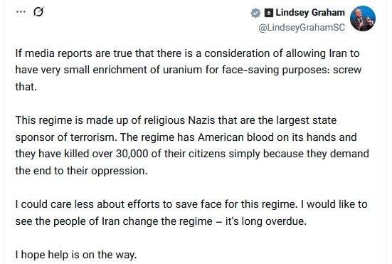 گراهام در پیامی در شبکه‌های اجتماعی هشدار داد که اگر گزارش‌های رسانه‌ای درباره بررسی امکان اجازه دادن به ایران برای غنی‌سازی اورانیوم در سطح بسیار پایین به‌منظور «حفظ آبرو» درست باشد، دولت آمریکا نباید چنین اقدامی انجام دهد. او حکومت ایران را «بزرگ‌ترین حامی تروریسم دولتی» خواند و تاکید کرد این رژیم «دستانش به خون آمریکایی‌ها آغشته است» و بیش از ۳۰ هزار نفر از شهروندان خود را به‌دلیل اعتراض کشته است.