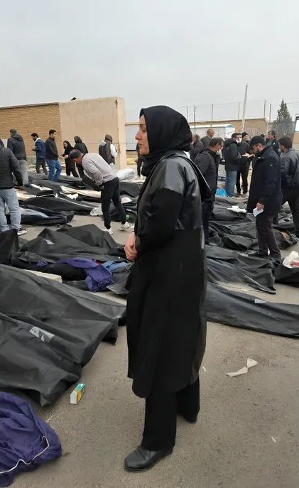 زنی مستاصل در کهریزک تهران در بین اجساد کشتهشدگان در کیسههای که سیاه زیپدار قرار داده شدهاند.