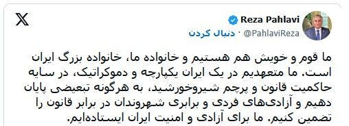 ما قوم و خویش هم هستیم و خانواده ما، خانواده بزرگ ایران است. ما متعهدیم در یک ایران یکپارچه و دموکراتیک، در سایه حاکمیت قانون و پرچم شیروخورشید، به هرگونه تبعیضی پایان دهیم و آزادیهای فردی و برابری شهروندان در برابر قانون را تضمین کنیم. ما برای آزادی و امنیت ایران ایستادهایم. pic.twitter.com/TedpFZu1KT