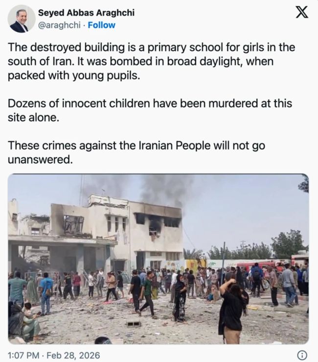 عباس عراقچی، وزیر امور خارجه ایران نیز با انتشار عکسی از این مدرسته در شبکه اجتماعی ایکس، اعلام کرد که این مدرسه تخریب شده است و «کودکان بیگناه» کشته شدهاند و «این جنایات علیه مردم ایران بیپاسخ نخواهد ماند.»
