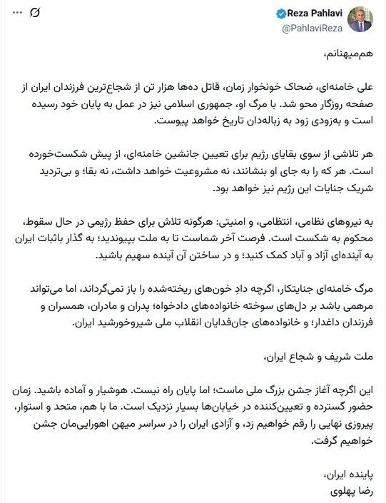 او همچنین خطاب به نیروهای نظامی، انتظامی و امنیتی نوشت: «هرگونه تلاش برای حفظ رژیمی در حال سقوط، محکوم به شکست است. این آخرین فرصت شماست تا به ملت بپیوندید، به گذار باثبات ایران به آیندهای آزاد و آباد کمک کنید و در ساختن آن آینده سهیم باشید.»