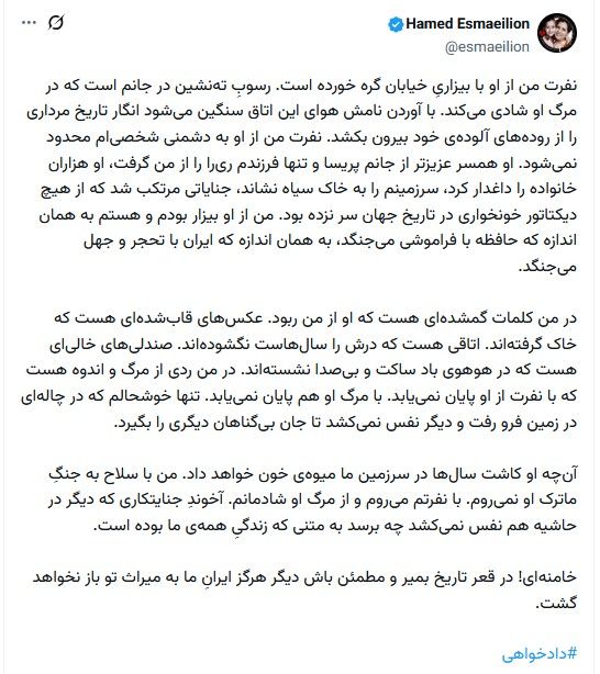 او در پایان پیامش نوشت: «خامنهای! در قعر تاریخ بمیر و مطمئن باش دیگر هرگز ایرانِ ما به میراث تو باز نخواهد گشت.»