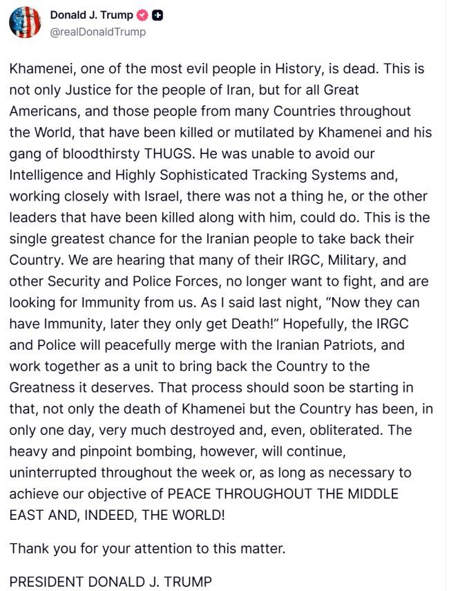 دونالد ترامپ در شبکه اجتماعی تروث از کشته شدن «خامنهای، یکی از شرورترین افراد تاریخ» خبر داددونالد ترامپ کمی بعد در شبکه اجتماعی تروث از کشته شدن «خامنهای، یکی از شرورترین افراد تاریخ» خبر داد و نوشت: «خامنهای، یکی از شرورترین آدمهای تاریخ، مرده است. این فقط تحقق عدالت برای مردم ایران نیست، بلکه برای همه آمریکاییهای بزرگ و مردمان از کشورهای گوناگون در سراسر جهان است که بهدست خامنهای و اراذل خونخوارش کشته یا ناقص شدهاند.»«او نتوانست از تور دستگاههای اطلاعاتی و سامانههای بسیار پیشرفته ردیابی ما فرار کند و در همکاری نزدیک با اسرائیل، نه او و نه دیگر رهبرانی که با او کشته شدند، مطلقا هیچ کاری از دستشان برنیامد. این بزرگترین فرصت برای مردم ایران است تا کشورشان را پس بگیرند.»