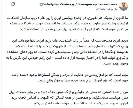 زلنسکی یکشنبه دهم اسفند در پیامی در شبکه اجتماعی ایکس نوشت: «مهم است که از این فرصت تغییر برای ایران به درستی استفاده شود. مهم است که موضع روشنی در حمایت از مردم و زندگی انسانها وجود داشته باشد.»
