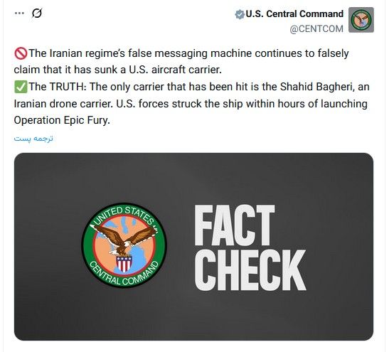 سنتکام در پیامی در شبکه اجتماعی ایکس تأکید کرد: «ماشین تبلیغاتی رژیم ایران همچنان بهدروغ مدعی است که یک ناو هواپیمابر آمریکایی را غرق کرده است.»