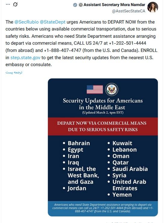 مورا نامدار، دستیار وزیر خارجه آمریکا در امور کنسولی همزمان با حملات آمریکا و اسرائیل به ایران، طی بیانیهای اعلام کرد که از شهروندان آمریکا خواسته شده است فورا کشورهای بحرین، مصر، ایران، عراق، اسرائیل، کرانه باختری و غزه، اردن، کویت، لبنان، عمان، قطر، عربستان سعودی، سوریه، امارات عربی متحده و یمن را ترک کنند.