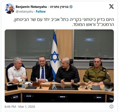 تصویری که توسط دفتر بنیامین نتانیاهو منتشر شده نشان میدهد که وی یک روز پس از فرود این هواپیما، در یک نشست امنیتی با حضور رئیس ستاد کل ارتش اسرائیل و رئیس موساد در پایگاه «کریا» واقع در تلآویو شرکت کرده است.