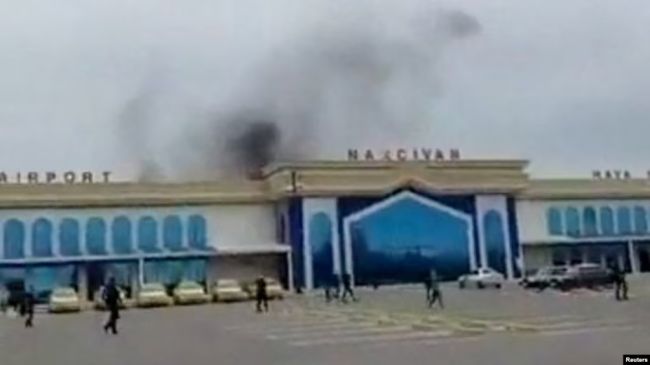 دود ناشی از اصابت پهپاد به فرودگاه نحجوان، حملهای که به ایران منتسب شده و واکنش شدید رئیسجمهور جمهوری آذربایجان را در پی داشته است