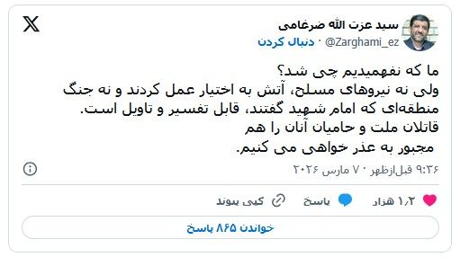 عزتالله ضرغامی، رئیس پیشین سازمان صداوسیما، در رد مواضع مسعود پزشکیان در شبکه ایکس نوشت که «نه نیروهای مسلح، آتش به اختیار عمل کردند» و نه «جنگ منطقهای» که علی خامنهای، رهبر سابق جمهوری اسلامی، پیش از کشته شدن وعده داده بود «قابل تفسیر و تاویل» است.