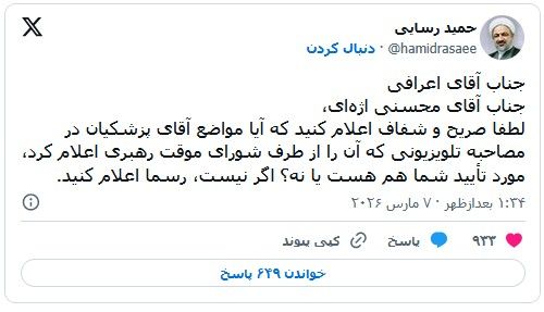 او در پیام دیگری در شبکه ایکس خطاب به دو عضو دیگر شورای موقت رهبری خواستار آن شد که بگویند اظهارات مسعود پرشکیان مورد تأیید آنها هست یا نه.