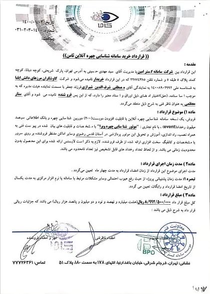 این نرمافزار تشخیص چهره برای «مدت نامحدود» و به قیمت ۴ میلیارد ریال (حدود ۸۰ هزار یورو در زمان امضا) به طرف ایرانی واگذار شده است. طبق قرارداد، فایندفیس باید امکان شناسایی «۱۰۰ میلیون چهره» را در تصاویر و ویدئوهایی که قبلاً ضبط و سپس در سامانه بارگذاری شده (آفلاین)، «در کمتر از ۳ ثانیه» فراهم کند.