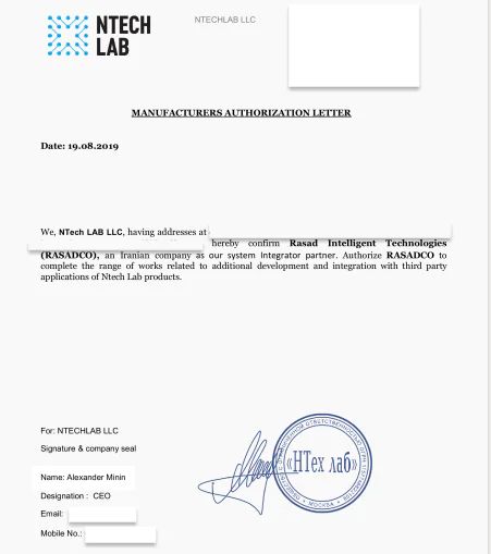 تصویری از قرارداد مهر شده فروش نرمافزار تشخیص چهره، اوت ۲۰۲۱. © فوربیدن استوریزخلاصه یافتههای فوربیدن استوریز: