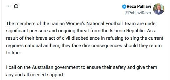 شاهزاده رضا پهلوی روز یکشنبه ۱۷ اسفند در پیامی در اکس با تقدیر از اعضای تیم ملی فوتبال زنان ایران نسبت به بازگشت آنان به ایران ابراز نگرانی کرد و از دولت استرالیا خواست امنیت آنان را تضمین کند و هرگونه حمایت لازم را در اختیارشان قرار دهد.