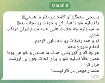 «شما به طور کامل تحت نظارت ما هستید. ما میدانیم چه جنایتهایی علیه مردم ایران مرتکب شدهاید. شما و تمام همکارانتان را شناسایی کردهایم. تسلیم شوید یا فرار کنید. هشدار دومی در کار نخواهد بود.»