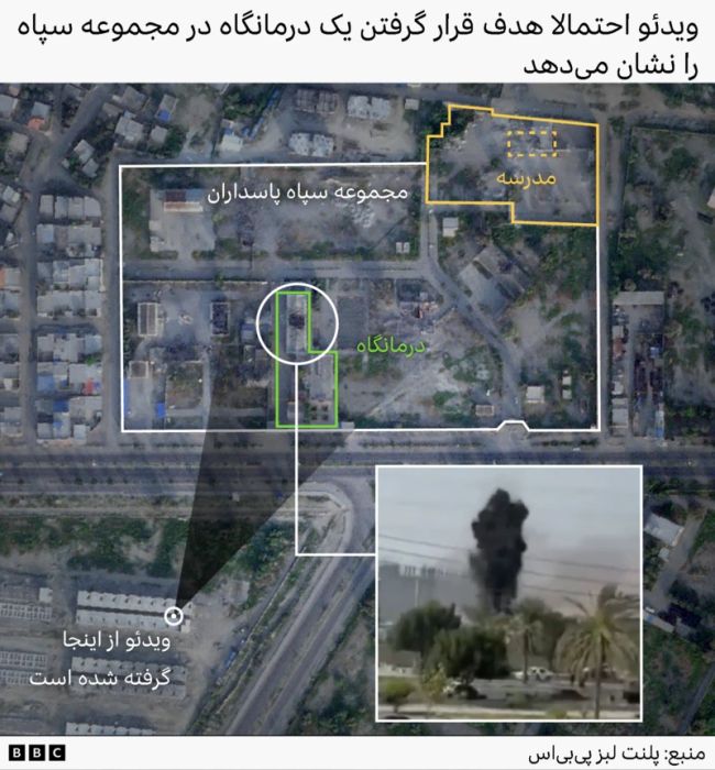 تحلیل بیبیسی وریفای از این ویدیو نشان میدهد یک درمانگاه که رسانههای ایرانی میگویند متعلق به نیروی دریایی سپاه بوده احتمالا هدف موشک تاماهاکی قرار گرفته که در تصاویر دیده شده است. این کلینیک حدود ۲۰۰ متر با مدرسه فاصله دارد.