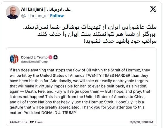 علی لاریجانی، دبیر شورای عالی امنیت ملی جمهوری اسلامی، با انتشار پیامی در ایکس، دونالد ترامپ را به «حذف» تهدید کرد. در این پیام خطاب به ترامپ آمده است: «ملت ایران، از تهدیدات پوشالی شما نمیترسند. بزرگتر از شما هم نتوانستند ملت ایران را حذف کنند. مراقب خود باشید حذف نشوید.»علی لاریجانی، دبیر شورای عالی امنیت ملی جمهوری اسلامی ایران به هشدار دونالد ترامپ رئیس جمهوری آمریکا درباره عدم ایجاد اختلال در جریان عرضه نفت در جهان واکنش نشان داد و او را تهدید به «حذف» کرد.