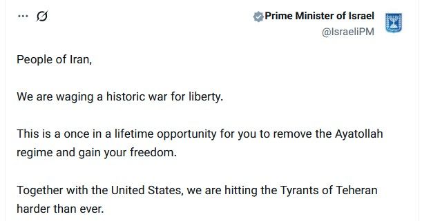 دفتر نخستوزیری اسرائیل در پیامی خطاب به مردم ایران نوشت: «مردم ایران، ما در حال پیشبرد جنگی تاریخی برای آزادی هستیم. این فرصتی است که تنها یک بار در زندگی پیش میآید تا رژیم آیتالله را برکنار کرده و آزادی خود را به دست آورید.