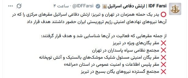 ساعاتی پیش نیز ارتش اسرائیل از حمله همزمان به مقرهای نهادهای امنیتی جمهوری اسلامی ایران در تهران و تبریز خبر داده بود.