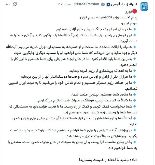 حساب کاربری فارسی وزارت خارجه اسرائیل در پستی با عنوان «فوری» پیام بنیامین نتانیاهو، نخستوزیر اسرائیل، خطاب به مردم ایران را در اواخر روز سهشنبه منتشر کرد.نخست وزیر اسرائیل در این پیام خطاب به مردم ایران گفت که در روزهای آینده شرایطی فراهم خواهد شد تا مردم ایران «سرنوشت خود را به دست بگیرند.»