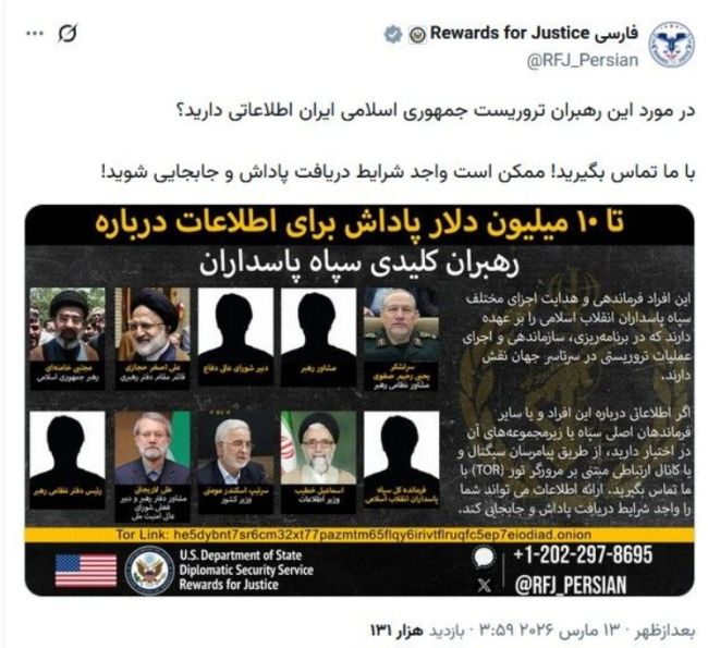 بنا بر پیامی که در شبکه ایکس منتشر شده، از افرادی که اطلاعاتی درباره فرماندهان یا ساختارهای مرتبط با سپاه پاسداران دارند خواسته شده است این اطلاعات را از طریق کانالهای امن در اختیار مقامهای آمریکایی قرار دهند.